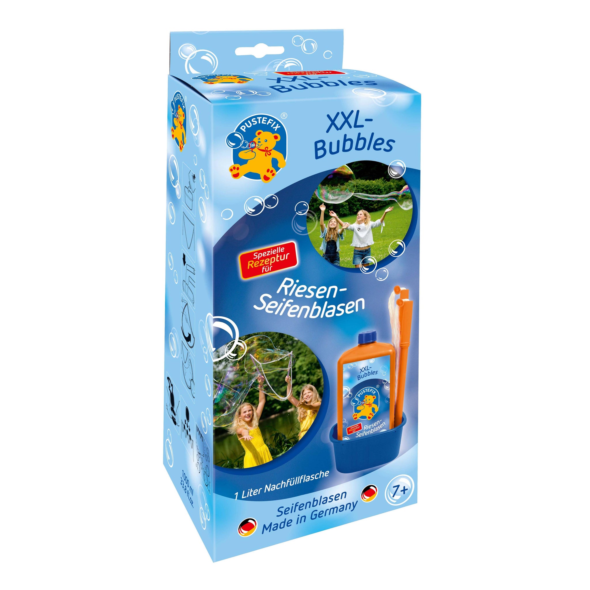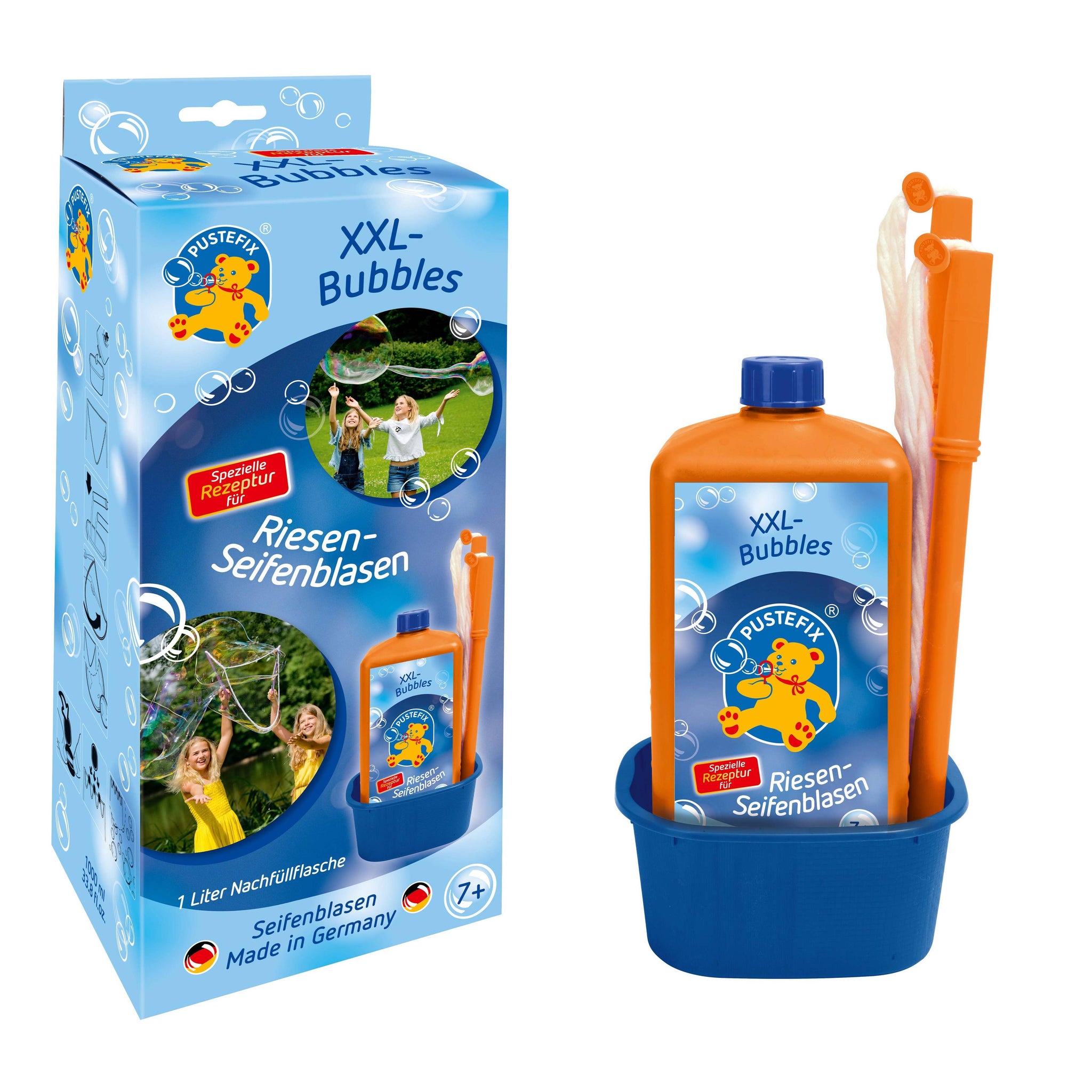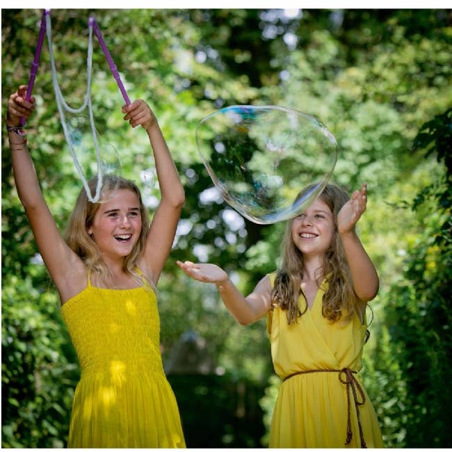 Fill the special formulated XXL Pustefix Bubble liquid into the tray and dip in the lace. Pull out the lace, keeping it loose between the sticks and gently pull it through the air. With the extra clips included, you can add multi loops to the lace for compound, bizarre shaped bubbles.